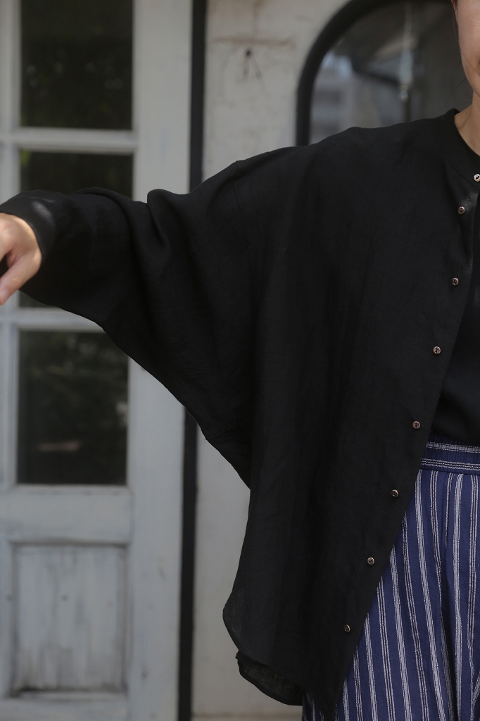 素材には、静岡県で時間をかけて丁寧に染め上げ、天日で自然乾燥させた荒めのリネンローンを使用。