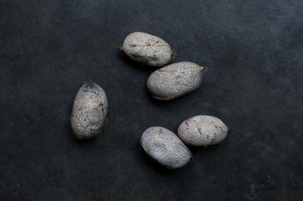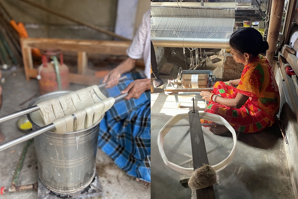 森の野蚕から採れるタッサーシルクを手で紡ぎ、手織りした生地は、