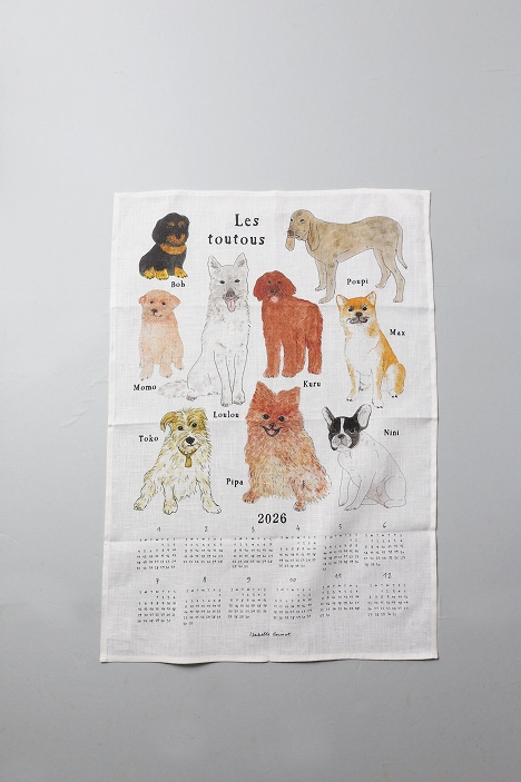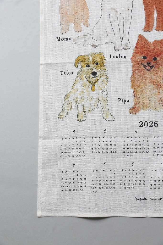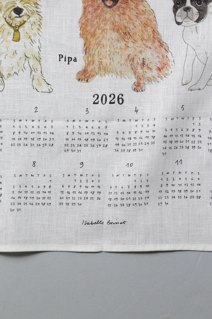 イザベル ボワノさんが描いたイラストをリネン生地にプリントした、2026年用のファブリックカレンダー。