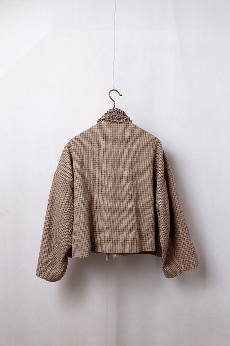 さりげないチェック柄の織りが施されており、フリルの甘さを抑え、