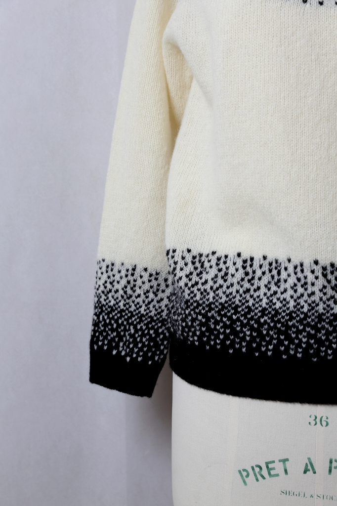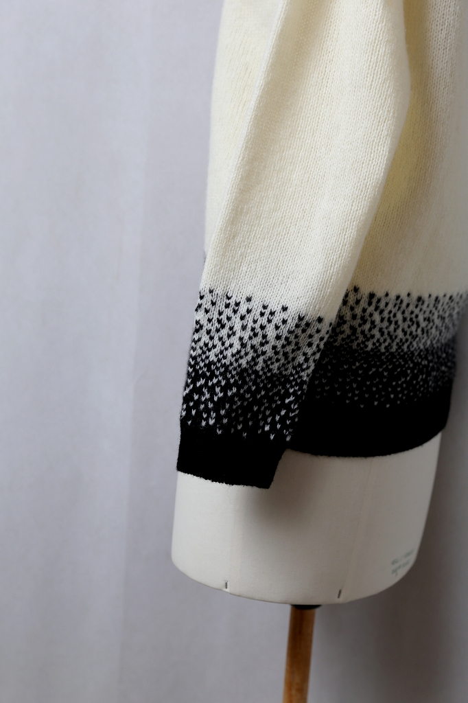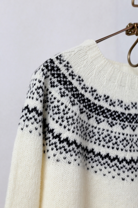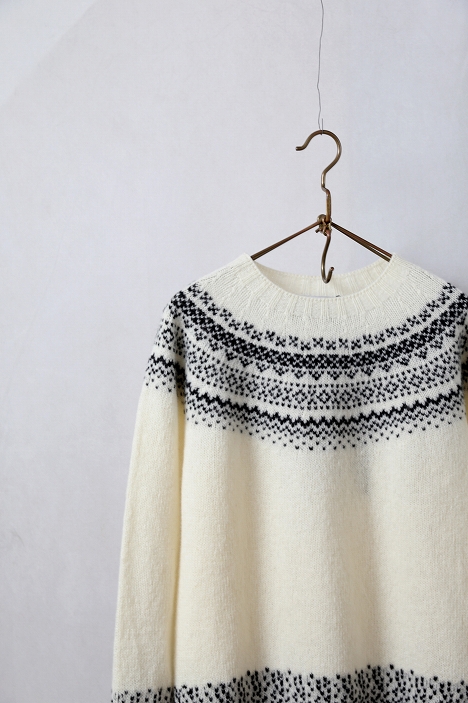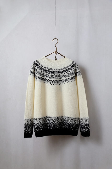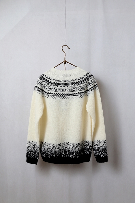 雪が舞い積もる情景を表現した特別な柄が美しい、軽くて暖かいクルーネックセーター。