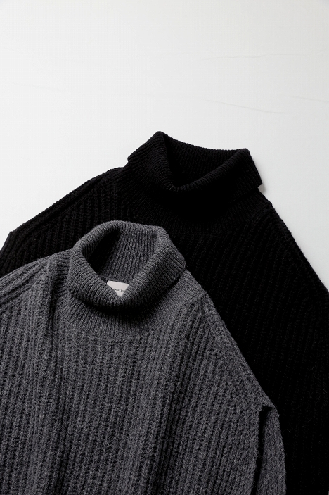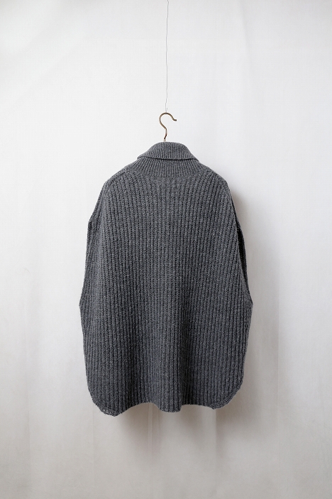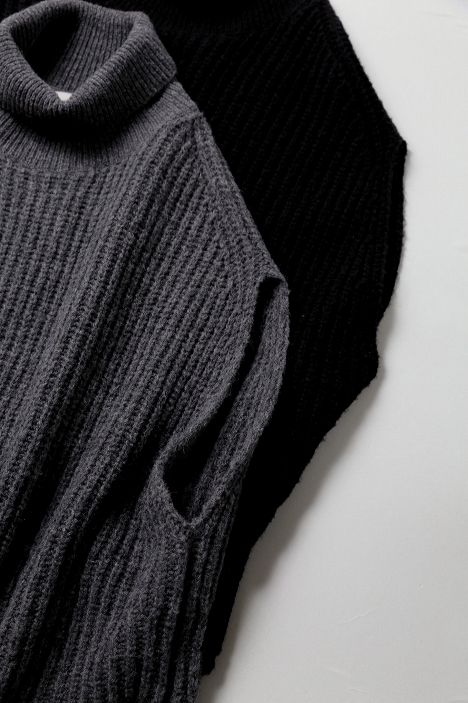 肩を包み込むサークルシルエットが特徴なタートルネックのニットベスト。